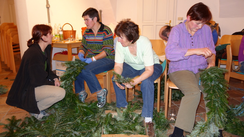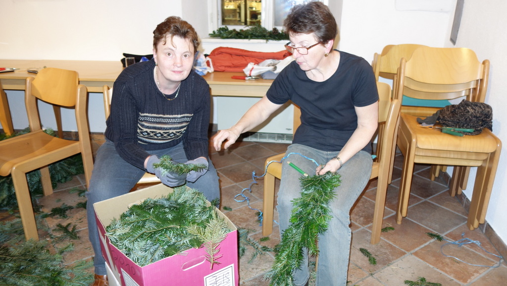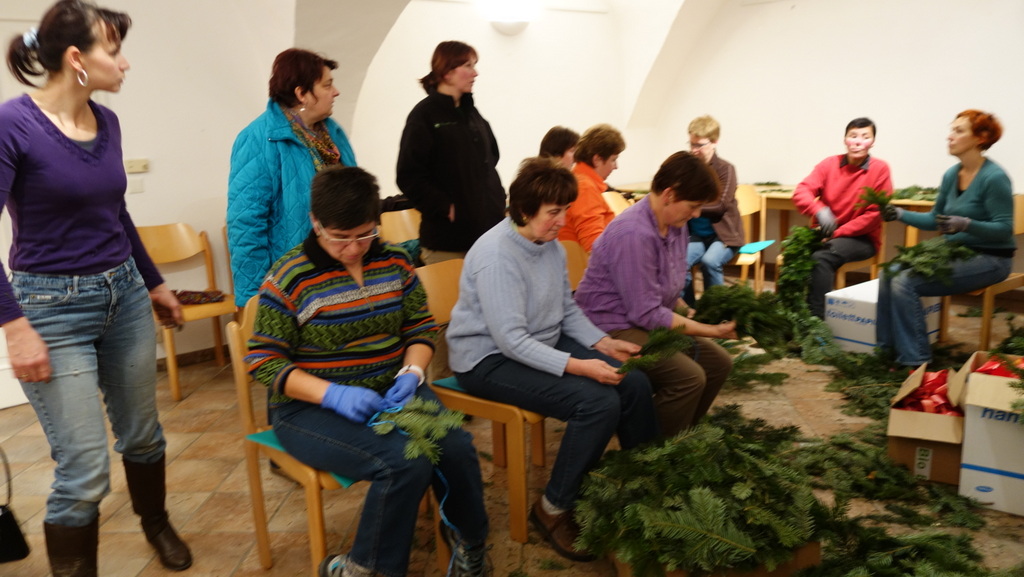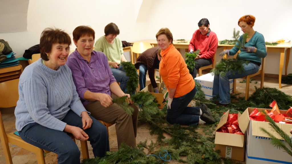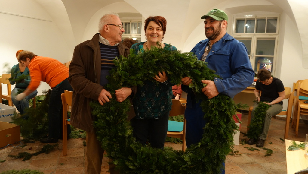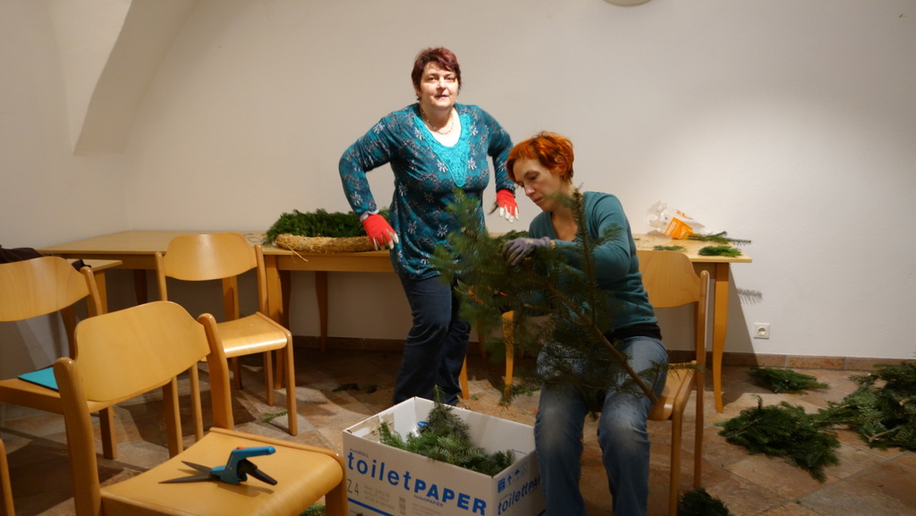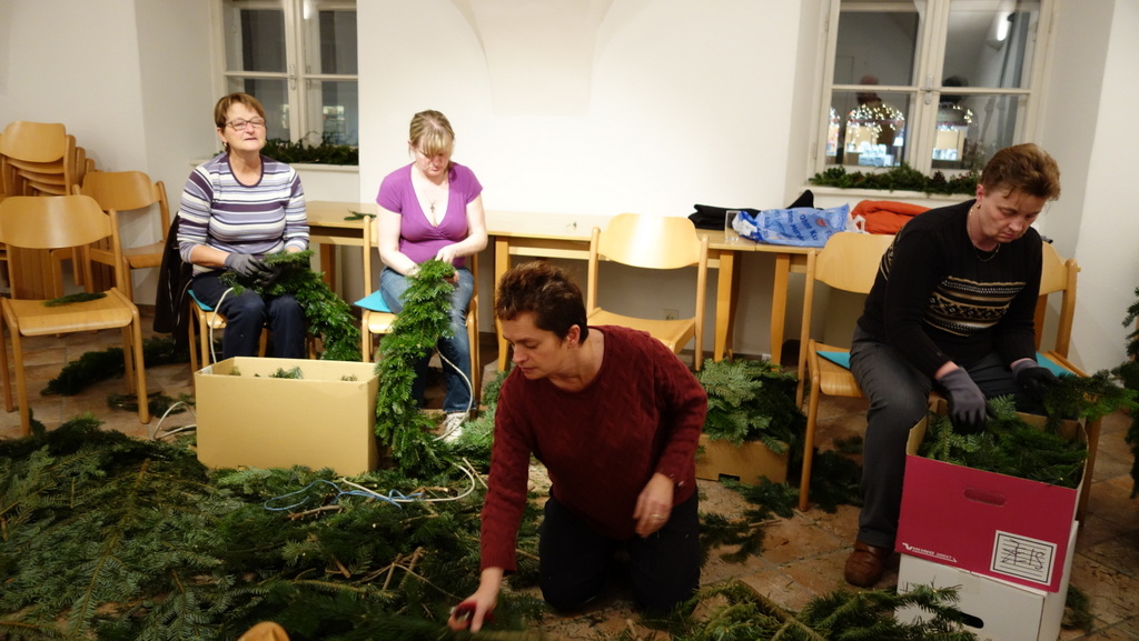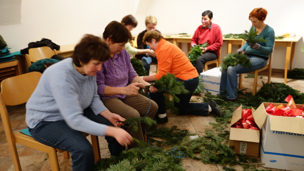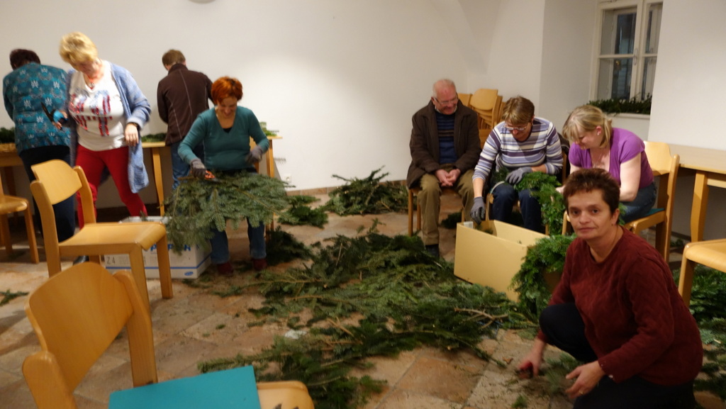 Viele Besprechungen Vorbereitungen sind erforderlich, und das Kranzbinden, dass am Montag, 24. November 2014 im Bürgerspital stattfand. Ein Danke allen HelferInnen, die mit großer Freude für den adventlichen Schmuck des Kilber Advents sorgten und die Kränze und Girlanden für unsere Kirche gebunden haben, an die Gemeinde für das zur Verfügung stellen des Bürgerspitals und Karl Luger für das wunderbare Reisig!!!!!!!!