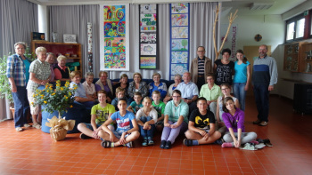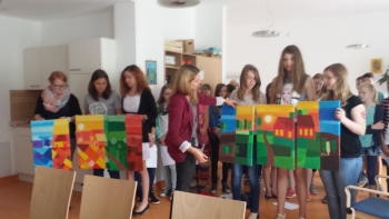 SchülerInnen der Neuen Mittelschule kamen am Montag, 29.6.2015, zu den BewohnerInnen des "Betreuten Wohnens" und erfreuten alle mit ihren Liedern und den selbstgemalten, farbenfrohen Bildern, die gleich gute Laune hervorrufen, und einen besonderen Ehrenplatz im Gemeinschaftsraum erhalten!
